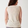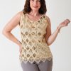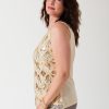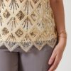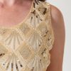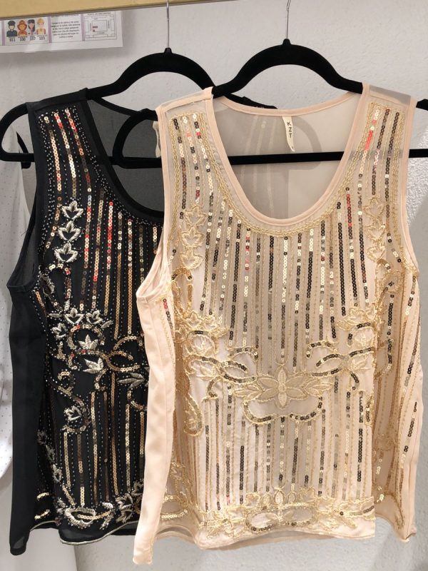 Blusa sin mangas con delantera que tiene apliques con lentejuelas y canutillos. Viene forrada para que no moleste al contacto con la piel.