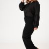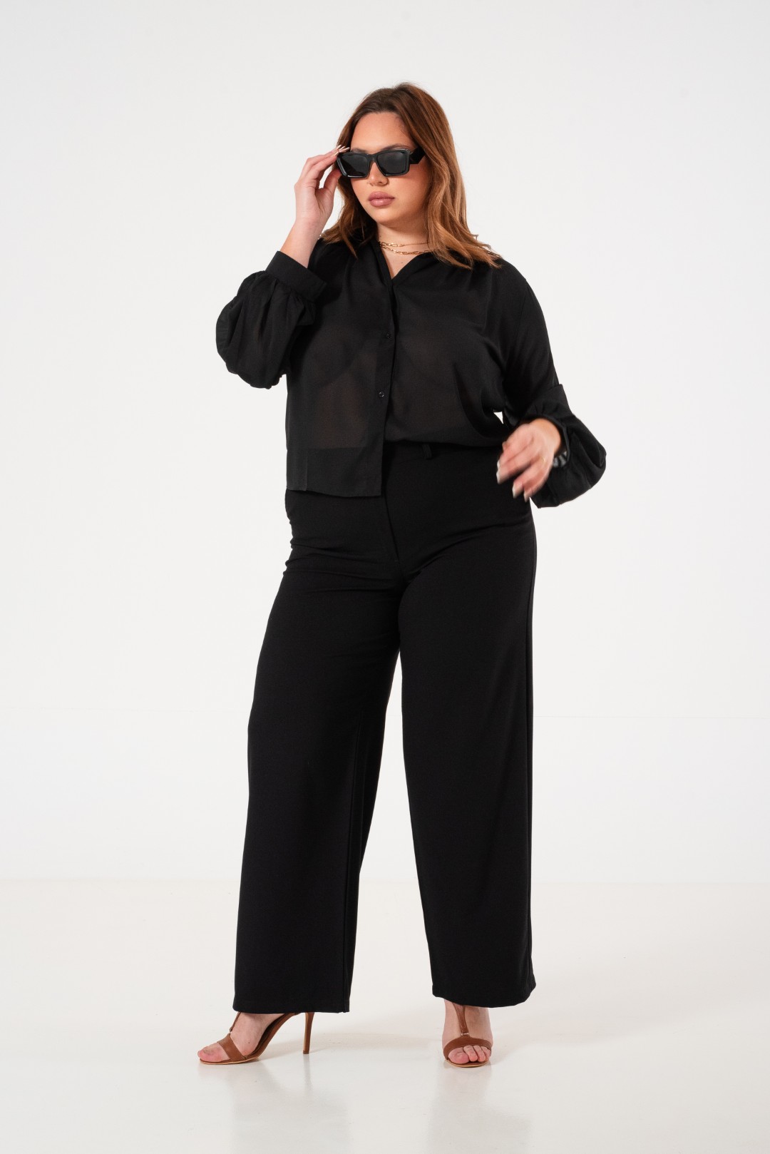 Pantalon tiro medio alto con bolsillos a los costado y falso bolsillo atras. Wide leg.
